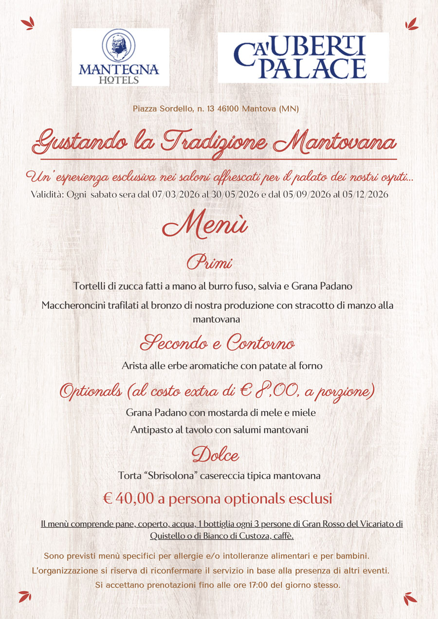 Nell’atmosfera raffinata e senza tempo di uno dei palazzi storici più affascinanti del centro storico di Mantova, avrete l’opportunità di lasciarvi trasportare in un viaggio sensoriale tra sapori, profumi e tradizioni che raccontano l’anima più autentica del nostro territorio.